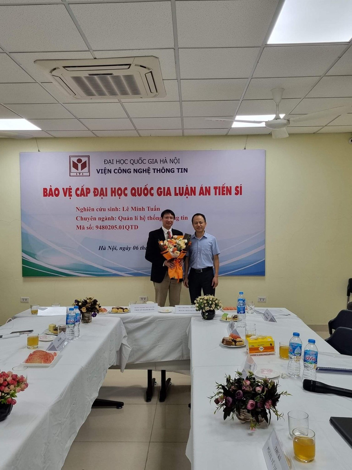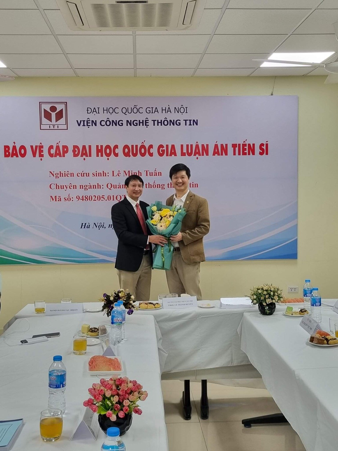 PGS.TS. Trần Xuân Tú, Viện trưởng Viện CNTT, ĐHQGHN tặng hoa chúc mừng NCS Lê Minh Tuấn.