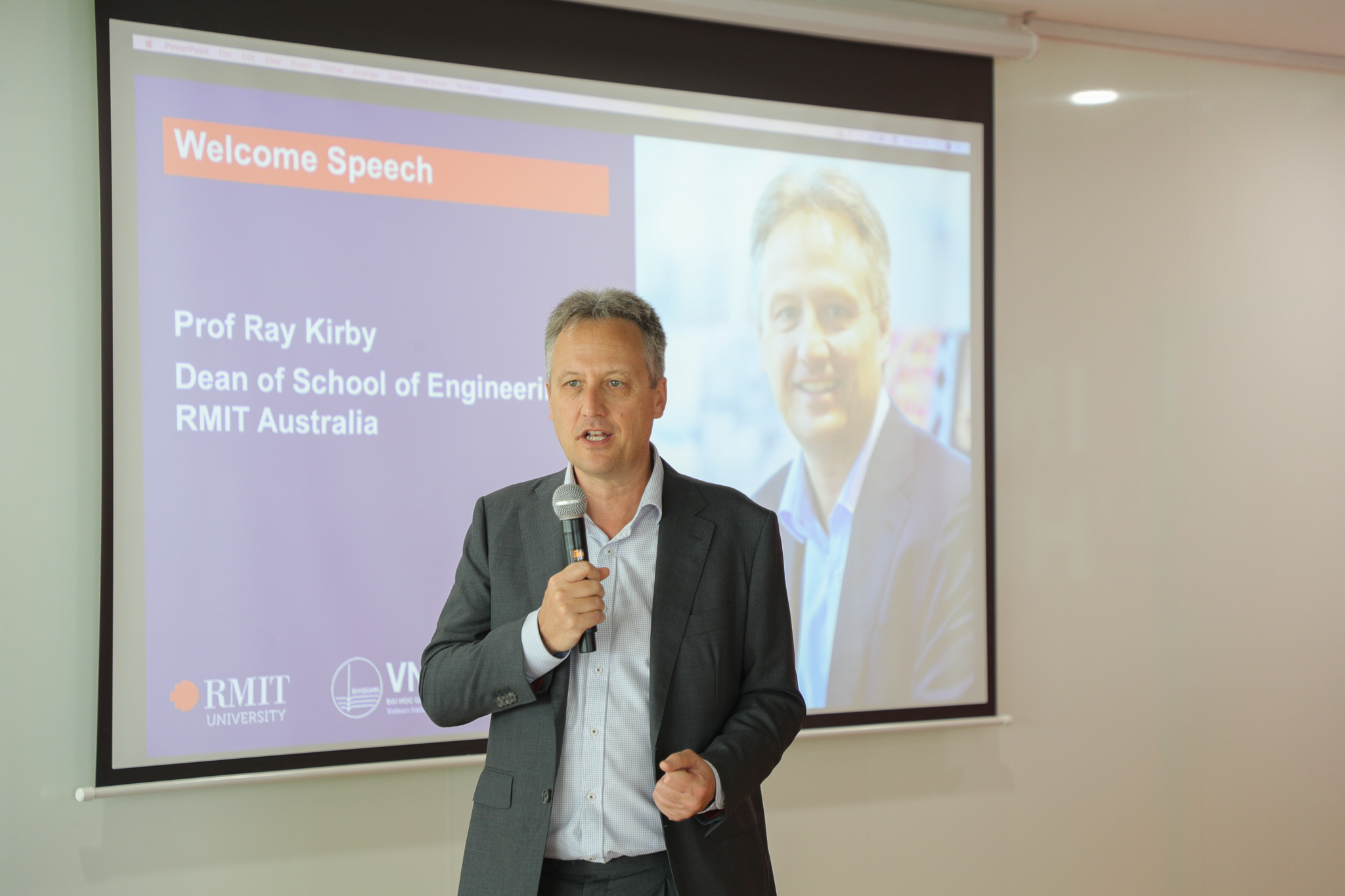 GS. Ray Kirby – Trưởng khoa Kỹ thuật, Phân viện STEM, ĐH RMIT Australia bày tỏ vui mừng khi được cùng hàng chục nhà khoa học, nhà nghiên cứu quy tụ tại VNU-RMIT Innovation Hub để cùng thảo luận về chủ đề AI và công nghệ bán dẫn. Ông mong rằng, tọa đàm không chỉ mang lại những chia sẻ hữu ích về chủ đề AI và công nghệ bán dẫn mà còn góp phần kết nối, thúc đẩy hợp tác giữa các bên, từ đó có thể chung tay giải quyết những thách thức mà xã hội đang đối mặt.