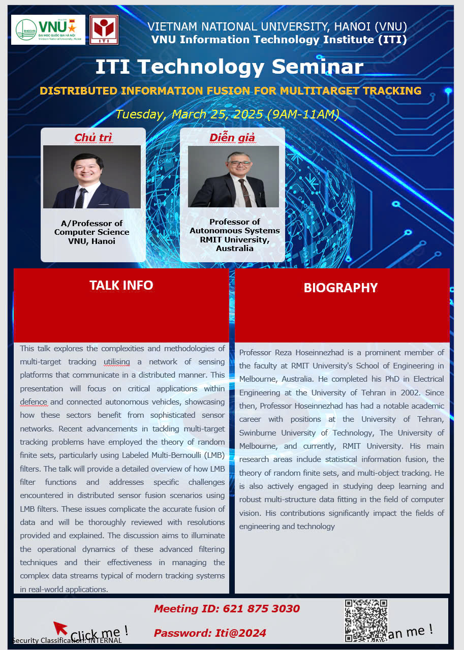 Viện Công nghệ Thông tin – Đại học Quốc gia Hà Nội tổ chức seminar “Distributed Information fusion for multitarget tracking”.