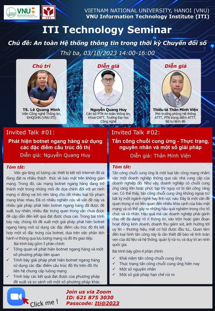 The Information Technology Institute – Vietnam National University, Hanoi invite you to attend the seminar on “Information Systems Security in the era of digital transformation”.