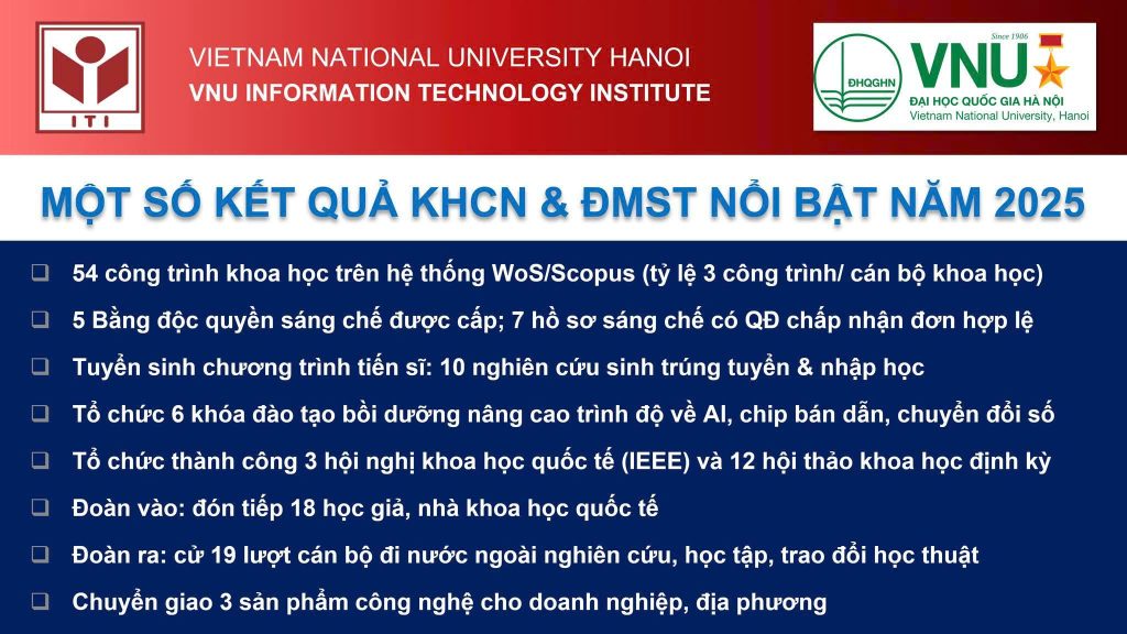 Năm 2025 khép lại với nhiều dấu ấn quan trọng, ghi nhận sự chuyển mình mạnh mẽ của Viện Công nghệ Thông tin – Đại học Quốc gia Hà Nội trong bối cảnh xuất hiện nhiều cơ hội và thách thức mới. Viện đã đạt được những bước tiến nổi bật trong lĩnh vực khoa học công nghệ, đổi mới sáng tạo và chuyển đổi số, tạo nền tảng vững chắc cho sự phát triển trong giai đoạn tiếp theo.