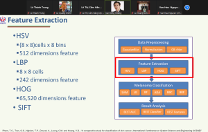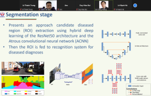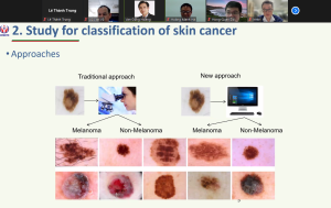 – “Kết hợp kỹ thuật phân vùng ngữ nghĩa và phân lớp trong bài toán dự đoán bệnh ngoài da” do PGS.TS. Hoàng Văn Dũng, Khoa Công nghệ thông tin, Trường ĐH Sư phạm Kỹ thuật TP. Hồ Chí Minh trình bày. Báo cáo trình bày một số vấn đề cơ bản và hướng tiếp kỹ thuật xử lý ảnh, học sâu trong trích xuất vùng quan tâm (ROI) và phân loại mẫu, bao gồm: Trích xuất ROI được thực hiện bằng kỹ thuật học sâu, lọc và làm mịn kết quả vùng ROI theo hướng sử dụng xử lý ảnh hình thái học, phân loại mẫu ảnh sử dụng học sâu với một số backbone điển hình như DenseNet, MobileNet, EfficientNet,… Bên cạnh đó, báo cáo cũng sẽ trình bày một số kết quả thực nghiệm, đánh giá trên bộ dữ liệu ảnh y tế chuẩn về bệnh ngoài da.