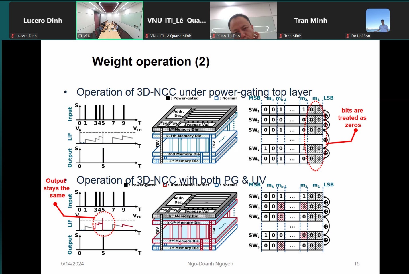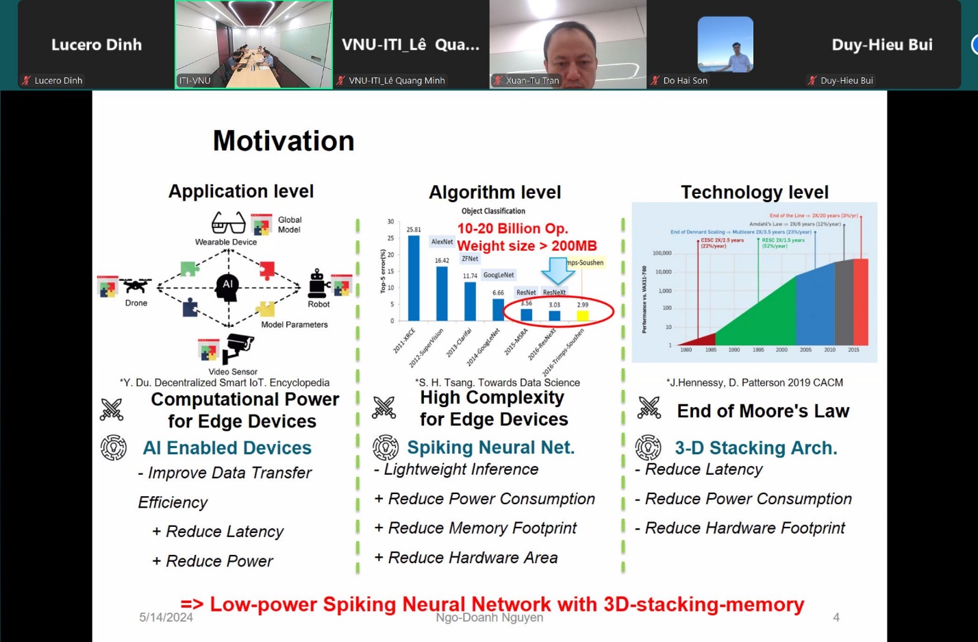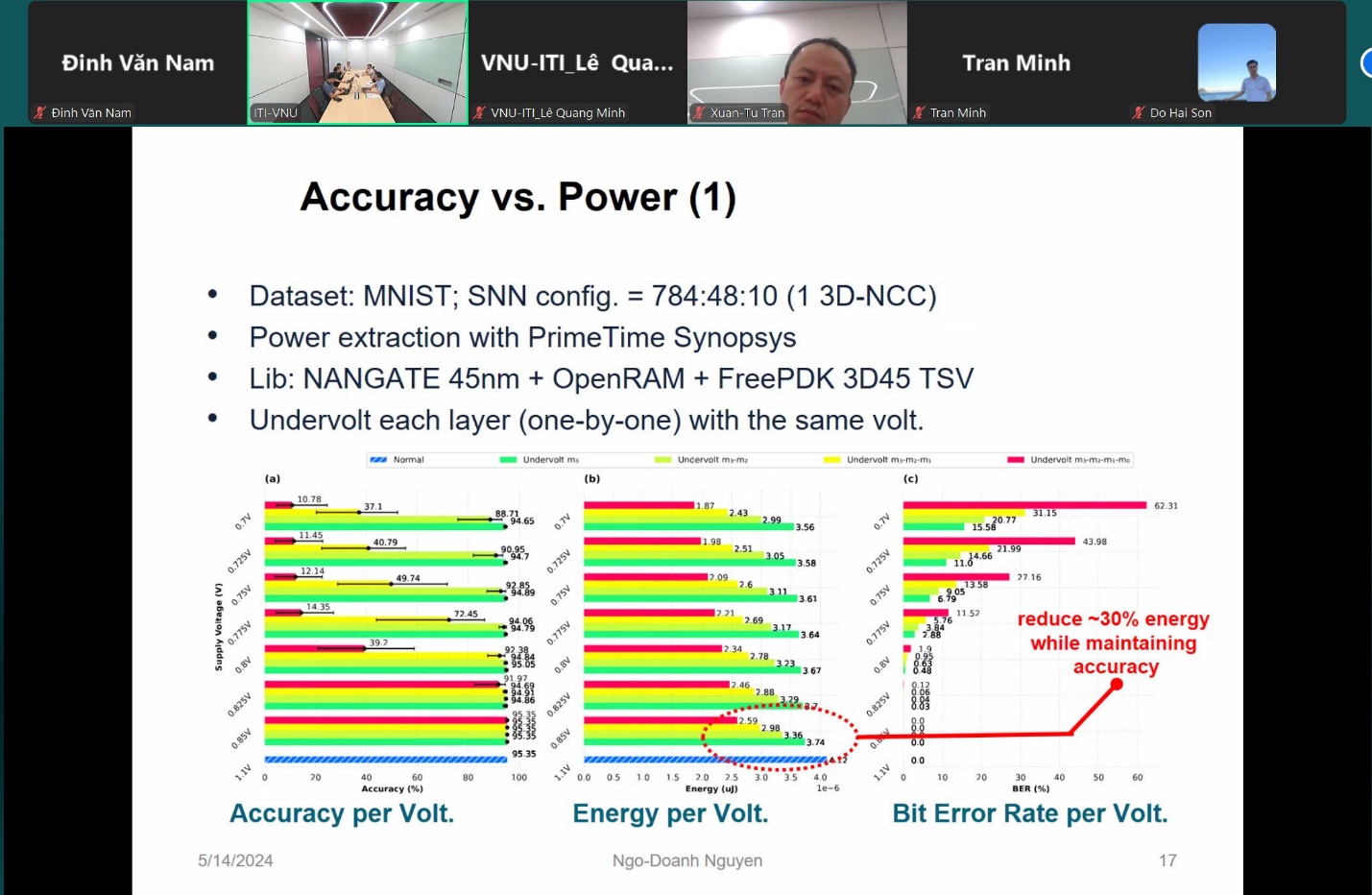 Bài thứ hai của buổi seminar của diễn giả Nguyễn Ngô Doanh là Thạc sĩ, nghiên cứu viên hiện đang làm việc tại Viện Công nghệ Thông tin. Bài báo cáo với chủ đề “Mạng nơ-ron mạch tích chập 3D công suất thấp”. Sự kết hợp giữa mạng nơ-ron spiking (SNN) và mạch tích hợp 3D giúp tiết kiệm năng lượng và tăng hiệu suất. Tuy nhiên, chỉ chuyển SNN vào cấu trúc 3D không thể khai thác hết tiềm năng của nó. Bài báo cáo này giới thiệu các tận dụng hiệu quả về mặt năng lượng của SNN bằng cách xếp chồng nhiều lớp bộ nhớ và chia trọng số synapse thành các tập hợp con trong các lớp cách ly khác nhau. Các kỹ thuật tiết kiệm năng lượng như ngắt nguồn và điều chỉnh điện áp được áp dụng cho từng lớp riêng biệt tùy theo tầm quan trọng của của các bit trọng số synapse. Mặc dù việc điều chỉnh điện áp có thể dẫn đến việc giảm độ chính xác của mạng nơ-ron nhưng hiệu suất của toàn bộ SNN chỉ giảm nhẹ so với hoạt động bình thường.