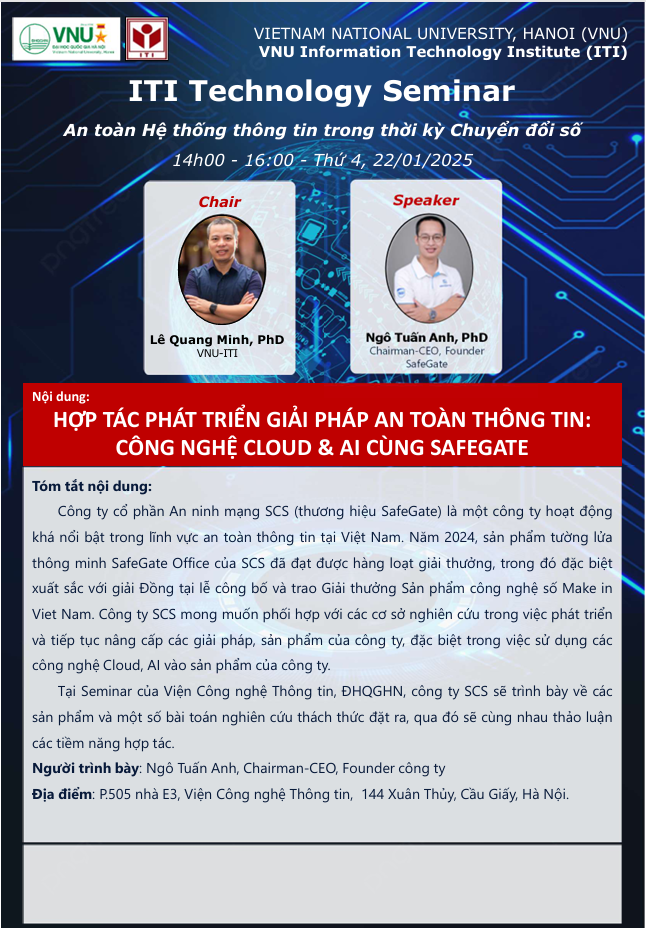 Viện Công nghệ Thông tin – Đại học Quốc gia Hà Nội và Công ty cổ phần An ninh mạng SCS Việt Nam tổ chức seminar “An toàn Hệ thống thông tin trong thời kỳ Chuyển đổi số”.