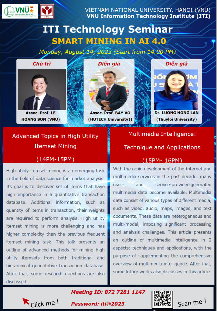 Viện Công nghệ Thông tin, Đại học Quốc gia Hà Nội trân trọng kính mời các thầy cô, nhà khoa học, chuyên gia công nghệ, người học tham dự seminar định kỳ với chủ đề “Smart Mining in Artificial Intelligence”.