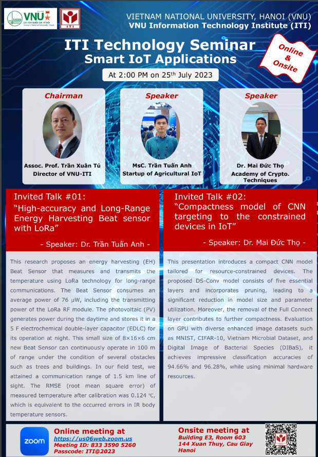 Viện Công nghệ Thông tin, Đại học Quốc gia Hà Nội trân trọng kính mời các thầy cô tham dự Seminar định kỳ với chủ đề “Smart IoT Applications: from R&D activities to Startup”.