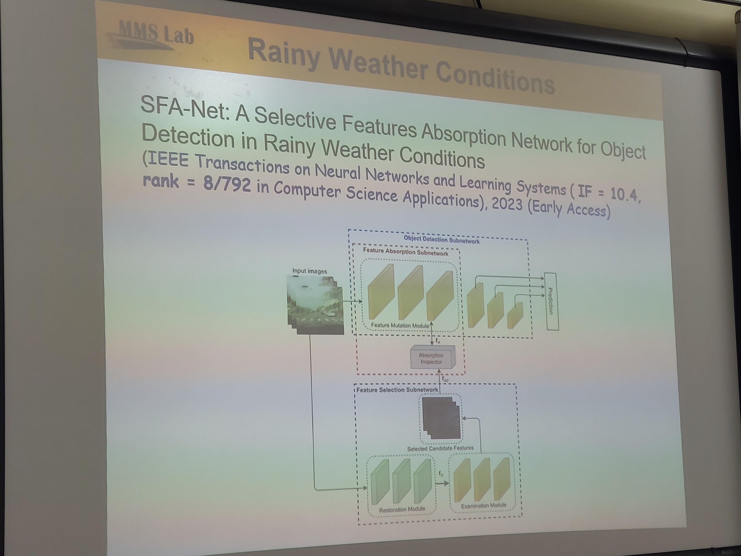 TS Lê Trung Hiếu cũng trình bày báo cáo mời về các công nghệ phát hiện đối tượng tích hợp học ngữ nghĩa ứng dụng trong các điều kiện thời tiết khác nhau. Các kỹ thuật Học sâu (Deep Learning) mới nhất được phát triển từ mạng noron tích chập (CNN) kết hợp thêm với các phương pháp học chuyển giao (Transfer Learning), Mạng hấp thụ đặc trưng (Feature Absorption SubNetwok), Mạng cải thiện đặc trưng (Feature Enhancement Network), Học đa miền (Domain Knowledge Distillation) ứng dụng trên các thiết bị cầm tay nhằm phân loại chính xác và địa phương hóa các đối tượng trong điều kiện sương mù. Các thiết kế kiến trúc mạng được trình bày cụ thể kèm theo các kỹ thuật học với các dòng dữ liệu khác nhau tương ứng với từng tác vụ được trình bày cụ thể. Các kỹ thuật này được công bố trên các tạp chí hàng đầu trong ngành trí tuệ nhân tạo như IEEE Transactions on Pattern Analysis and Machine Intelligence, IEEE Transactions on Neural Networks and Learning Systems, IEEE Transactions on Cybernectics,…