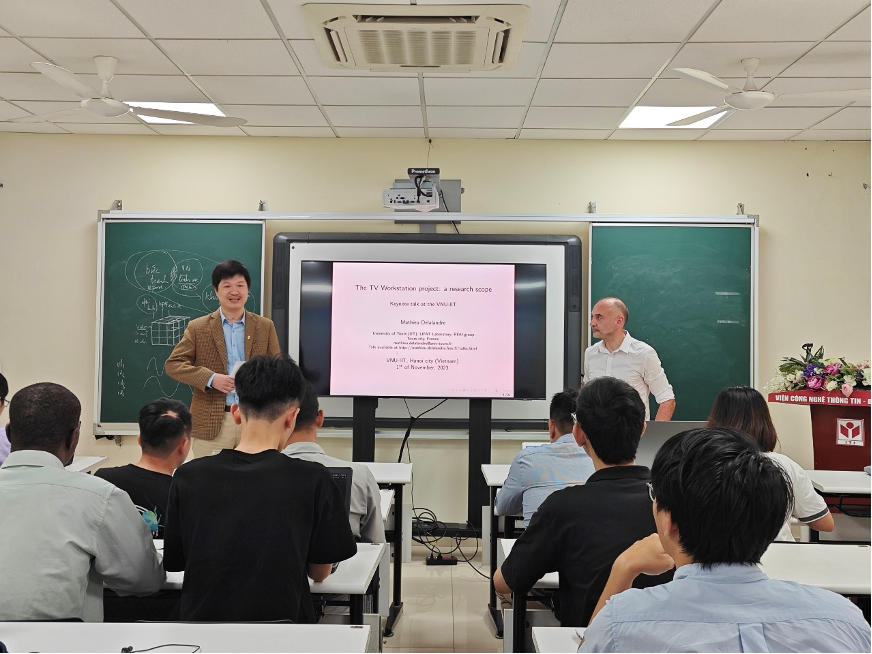Vào sáng ngày 01 tháng 11 năm 2023, Viện Công nghệ Thông tin tiếp Giáo sư Mathieu Delalandre- chuyên gia đến từ trường Đại học Tours và là thành viên của Laboratoire d’Informatique Fondamentale et Appliquée (LIFAT) tại Pháp. Tham gia tiếp Giáo sư Mathieu Delalandre có PGS. TS Lê Hoàng Sơn, Phó Viện trưởng Viện Công nghệ Thông tin cùng nhóm nghiên cứu Công nghệ Vi mạch và nhóm nghiên cứu mạnh về Trí tuệ nhân tạo AI 4.0. Tại buổi gặp mặt, PGS. TS Lê Hoàng Sơn đã giới thiệu sơ lược về Viện Công nghệ Thông tin cùng các hướng nghiên cứu chính tại Viện trong thời gian gần đây, đồng thời bày tỏ rõ quan điểm về việc xây dựng các hướng nghiên cứu hiện đại có sự tham gia của các chuyên gia và học viên quốc tế trong thời gian tới. Đồng quan điểm này, Giáo sư Mathieu Delalandre cam kết sẽ tham gia đồng hành cùng Viện trong các hướng nghiên cứu chuyên sâu về Thị giác máy tính và Dữ liệu Đa mô thức.