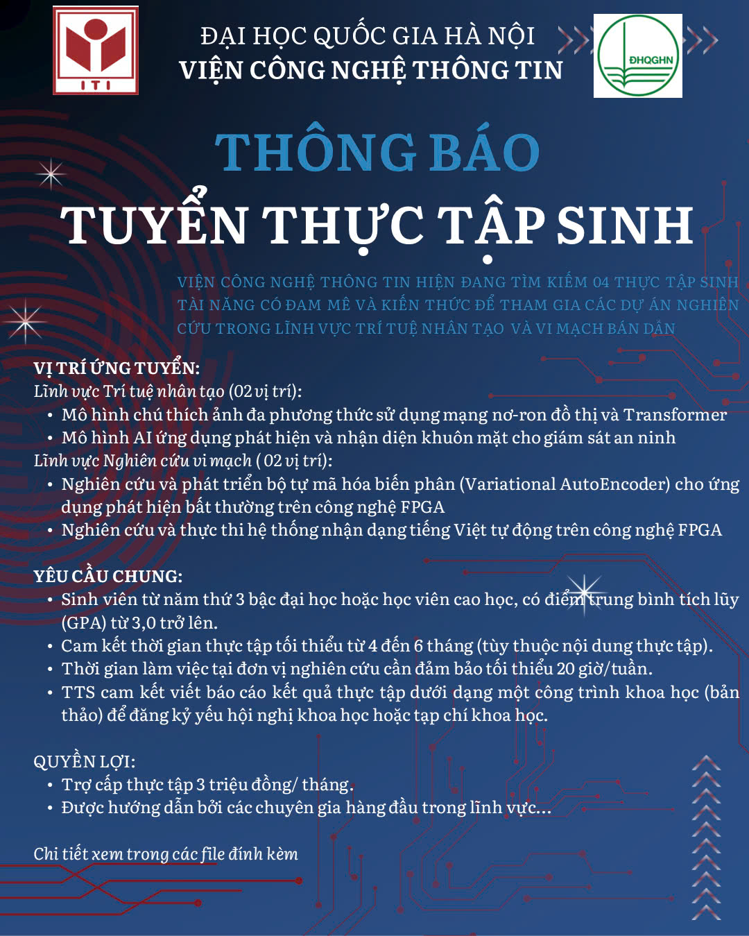Viện Công nghệ Thông tin hiện đang tìm kiếm 04 thực tập sinh tài năng có đam mê và kiến thức để tham gia các dự án NGHIÊN CỨU trong lĩnh vực Trí tuệ nhân tạo (AI) và Vi mạch bán dẫn